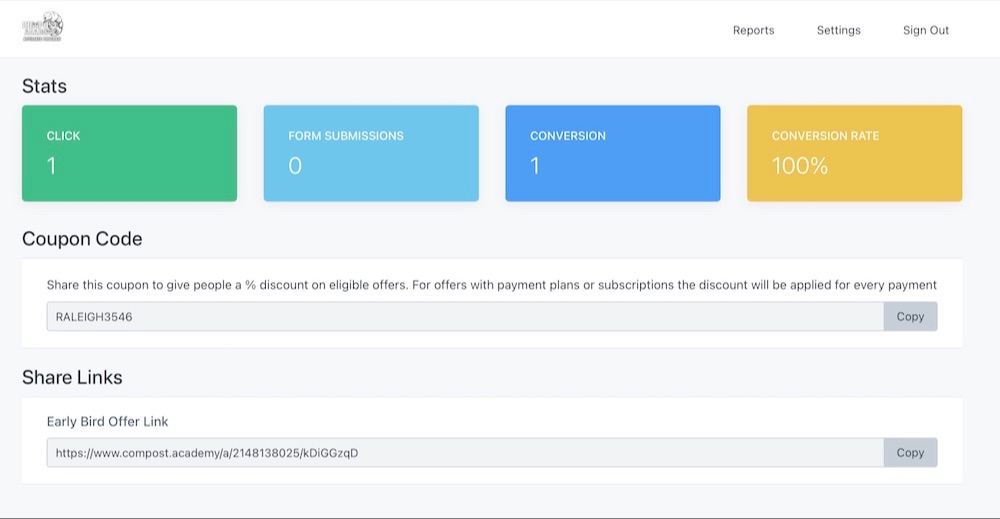 Create an affiliate account with the link below. This will allow you to access the affiliate dashboard and get your links and coupons, as well as check commissions and payouts.